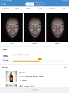 Notre machine prendra 5 photos en quelques secondes en utilisant différents spectres. Ces 5 images seront analysées par l’application Meicet, et finalement 12 images pourront être obtenues pour aider à révéler différents problèmes de peau.