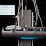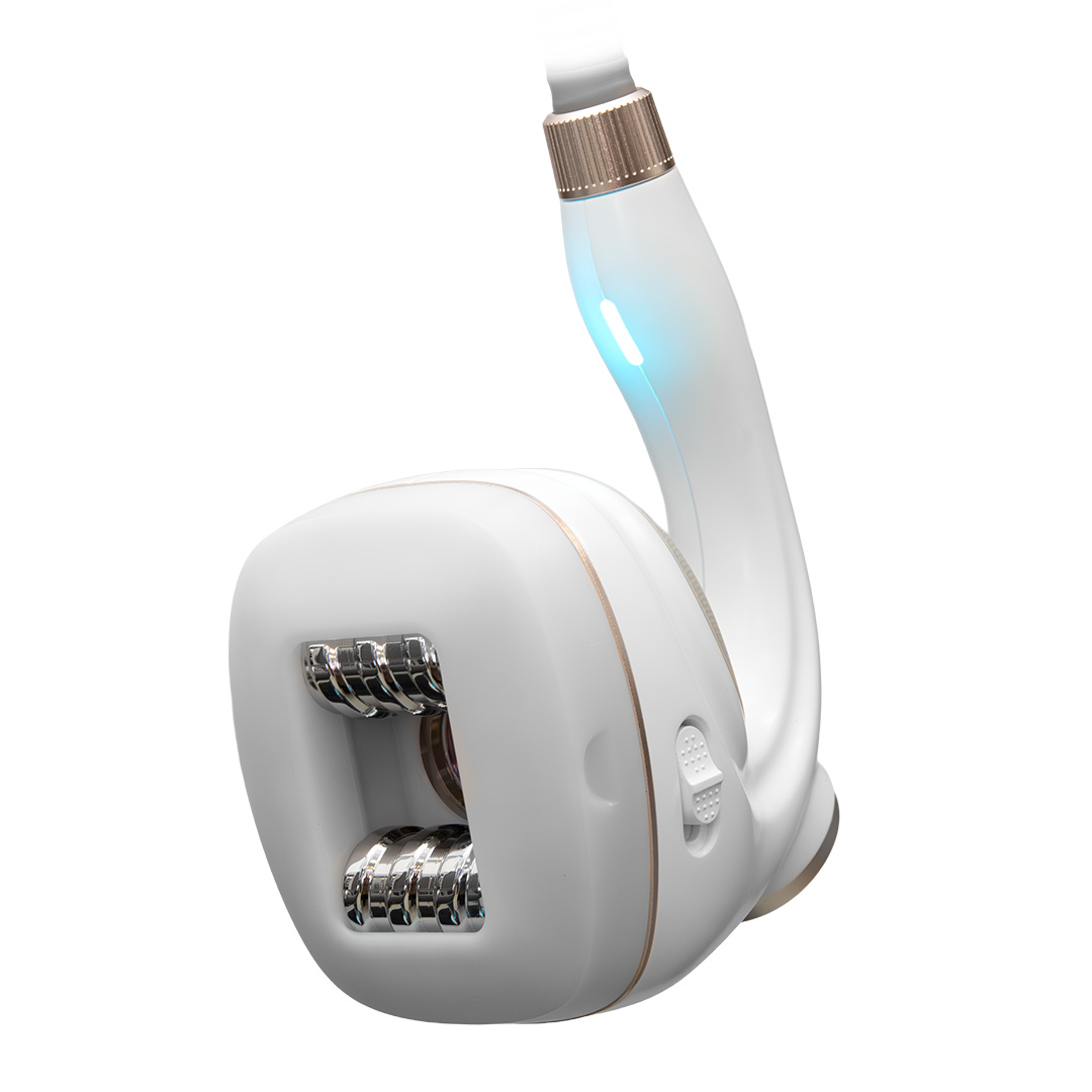 Boîtier moderne et futuriste avec une étagère fonctionnelle pour les têtes de traitement, pivotée à 90°, facilitant le transport et l'utilisation de l'appareil.